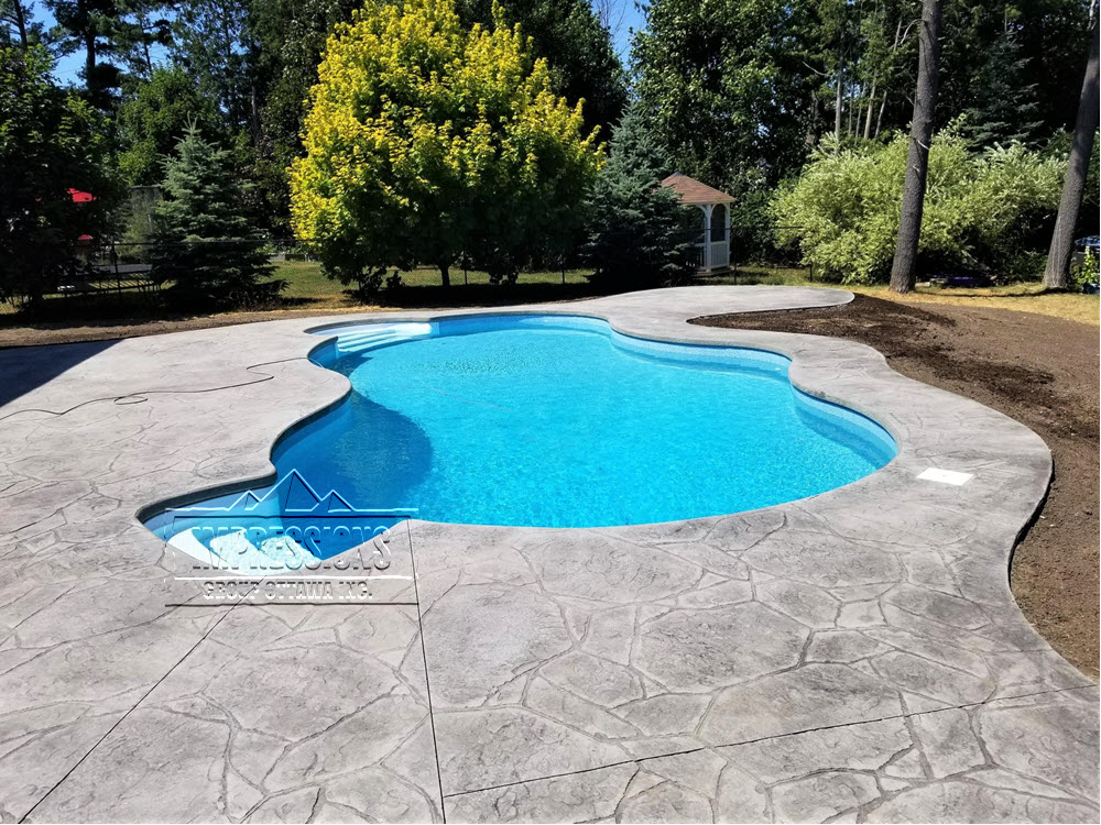 Stamped concrete is the process of pressing decorative or natural impressions into wet concrete using rubber stamps. This is a great way to add a unique flair to your pool deck, patio, walkway or driveway. There are many benefits to using stamped concrete. Concrete is one of the most durable building materials available for paving. This comes in handy for high traffic areas such as driveways and walkways. With proper preparation, steel reinforcing and finishing techniques, stamped concrete is second to none in terms of its durability. Choosing stamped concrete over other paving materials (such as natural stone) can be a more economical choice. When installed properly, with rebar enforcing as done at Impressions, stamped concrete can offer the same looks as natural stone and slate but with the durability to last a lifetime. The biggest advantage to stamped concrete is the variety of appearances and colours combined with the durability of concrete. Concrete stamping provides unlimited design opportunities such as aged cobblestones, brickwork, flagstones, slate tile, marble, granite, wood, or just about any natural surface.